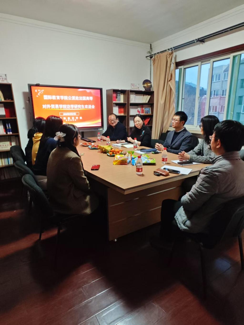 2月28日,2138cn太阳集团召开欢送会。欢送远赴法国高等对外贸易学院访学的研究生。2138cn太阳集团党委书记张红燕、院长杨春晓、党委副书记王伟、院长助理王英杰,教授赵迎、青年教师逄思佳及三位赴法研究生参会。