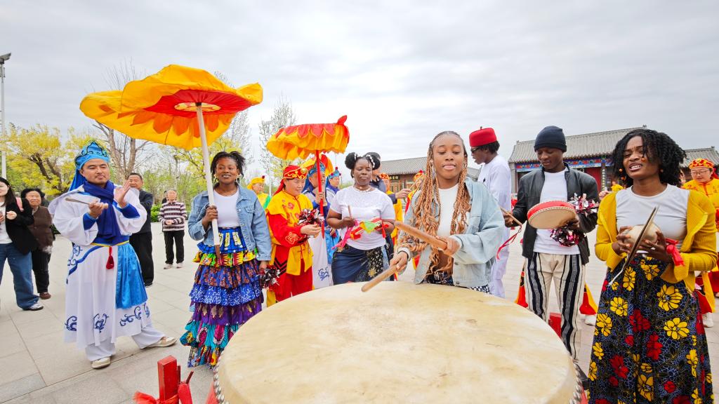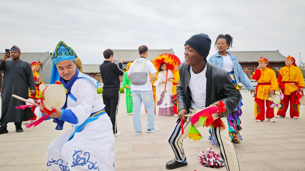 商河县鼓子秧歌作为闻名遐迩的民间艺术瑰宝,已被批准列入第一批国家级非物质文化遗产名录。本次活动为中外师生搭建起一座近距离触碰与感悟非遗文化魅力的桥梁。在孟子书院前广场,商河鼓子秧歌表演以磅礴的气势拉开序幕。舞者们身着鲜艳的传统服饰,头戴彩绸,手持红绸鼓槌,随着铿锵有力的鼓点腾挪跳跃,时而如蛟龙出海,时而似猛虎下山,展现出黄河文化特有的豪迈与热情。随后,来自非洲的留学生也献上了热情奔放的非洲传统舞蹈,他们以激越的鼓点配合高亢的吟唱,用充满力量的身体律动和色彩斑斓的服饰,演绎了非洲大地的生命力。中国传统大鼓与非洲的手鼓鼓点此起彼伏,带来了文化的交融与碰撞,现场笑声与欢呼声交织,形成一幅“鼓声连四海,歌舞共融情”的生动画面。
