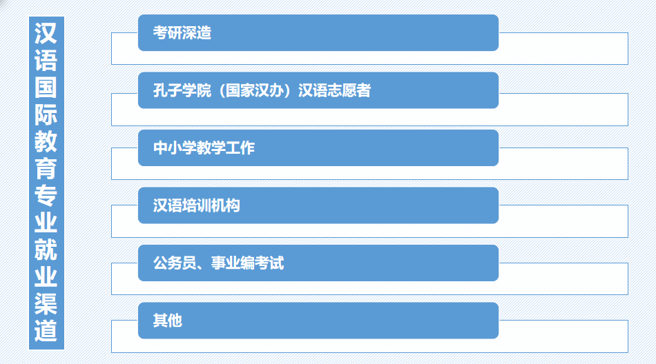 1.以宽口径、复合型人才培养为特色,关注学生的专业发展与职业能力提升,培养“一专多能”复合型人才。毕业生可胜任国内外各类学校、新闻出版、文化管理及其他企事业单位的国际中文教育、语言文化传播及中外文化交流等相关工作。