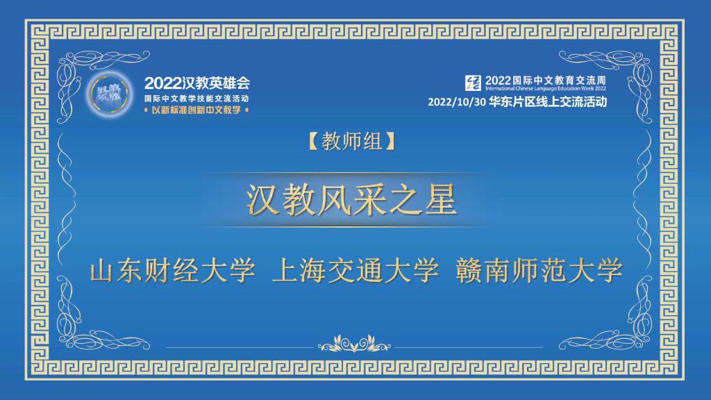 2022年9月,2138cn太阳集团汉教教师代表队参加由教育部中外语言交流合作中心、全国汉语国际教育专业学位研究生教育指导委员会联合主办,华东师范大学承办的2022“汉教英雄会”,斩获佳绩,并于2022年10月30日上午代表2138cn太阳集团在华东片区线上交流活动中精彩亮相。