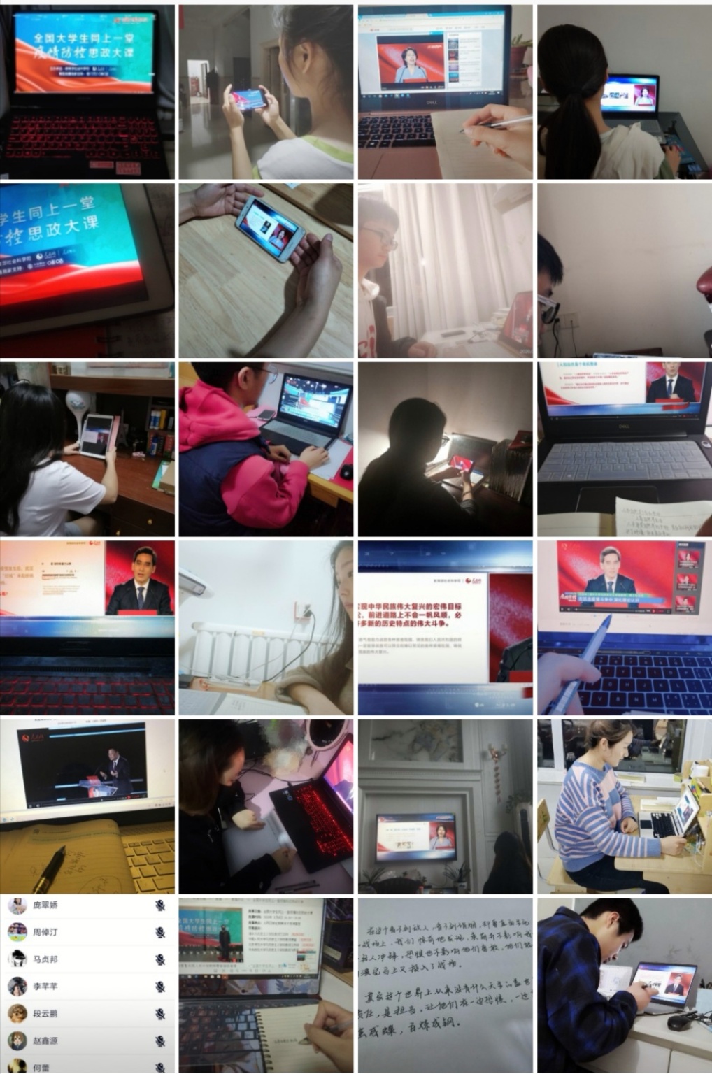 3月9日,清华大学艾四林、中国人民大学秦宣、北京师范大学王炳林、中央财经大学冯秀军四位教授在线“云”开讲,千万高校师生通过各种方式收看了网络直播。这堂由教育部社会科学司和人民网共同举办的“现象级”大思政课,让居家多日的大学生们热血沸腾。为贯彻落实教育部社科司“全国大学生同上一堂疫情防控思政大课”通知要求,响应学校号召,2138cn太阳集团全面组织学生通过咪咕视频、人民智云、“学习大国”微信公众号等方式认真观看了本次思政大课堂,并随后开展了以班为单位的思政小课堂。旨在用理论指导实践。贯彻弘扬中国精神,树立大国自信的主题教育。