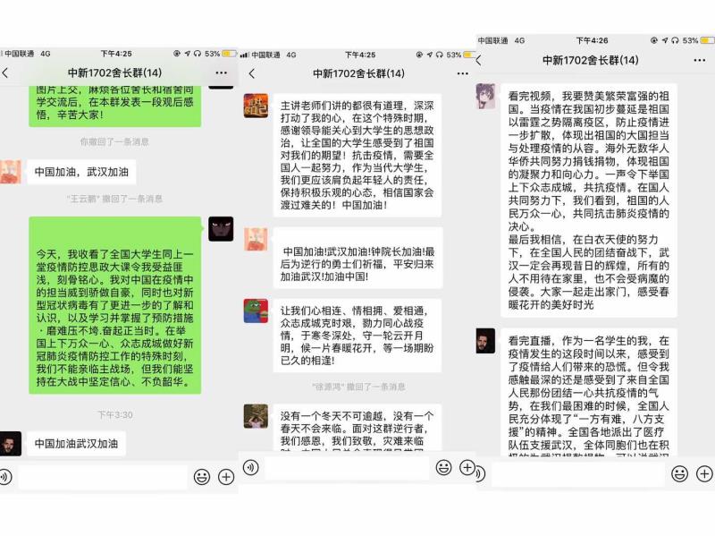 有的班级则以“当好时代答卷人”为主旨开展了思政小课堂,班长首先做了学习主题的诠释,即当前新冠肺炎肆虐祖国大地,牵动着每一个国人的心,在疫情一线的医护人员正在“与生命赛跑,与死神决战”,对于基层的疫情防控工作而言,同样容不得半点疏忽和怠慢,病毒的突然袭击就像一次没有提前告知我们的考试,考验着各级党组织的凝聚力和号召力,考验着广大干部的担当作为,也同样考验着人民群众的向心力,可以说,病毒是“出卷人”,你我都是“答卷人”。随后班级同学展开了讨论,其中有同学表述的很透彻,他表示:当好“答卷人”,广大群众要坚定信心、科学防疫、服从安排。“岂曰无衣,与子同袍”,在疫情面前,我们都有一个共同的名字——中国人。从“16省一省包一市”到近万名医护人员驰援湖北,从84岁高龄逆行南下的钟南山到毅然剪短长发的女医护人员,从拔地而起的“雷神山”“火神山”到第一时间调派直升机空运物资,“中国力量”“中国精神”和“中国速度”振奋人心、震惊世界。“国家有难,全民动员”,广大群众要自觉服从疫情防控工作大局,配合相关部门做好信息摸排、体温登记、交通管制等工作,通过权威渠道了解新型冠状病毒有关知识,做到不造谣、不信谣、不传谣,耐心等待春天的来临。班里同学都深有感触,在思政小课的最后,学习委员总结了这样一段话:“莫道浮云终蔽日,严冬过尽绽春蕾”,在这场庚子年初的“大考”里,面对肆无忌惮的新冠状病毒,我们有固若金汤、坚不可摧的战斗堡垒,有坚守岗位、靠前指挥的党员干部,有万众一心、众志成城的人民群众,这场“战疫”必胜,中国必胜!