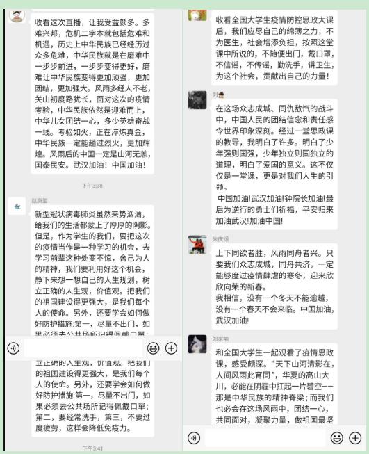 有的班级同学以“人人站在疫情的‘一线’”为主旨,组织班级50多名同学开展了思政小课堂。班级讨论中提到新型冠状病毒感染导致的肺炎疫情牵动国人的心。朋友见面、微信聊天、朋友圈分享,几乎三句不离最新疫情的进展。讨论的背后是人们对疫情的关注,也是对自身、家人健康的担忧。自疫情发生以来,一些人为了个人利益,在网络上制造传播散布谣言营造恐怖氛围,利用消费者焦虑哄抬物价获取暴利,不仅加剧了人们的焦虑,更影响社会秩序。疫情面前任何人无法置身事外,所有人唯有放下私利才能打赢这场战役。在个人发言中同学也提到疫情面前所有人应当承担起应有的社会责任。虽然每个人都拥有行动的自由,但疫情当前还应当以大局为重。其实,疫情的防治考验着我们,这不仅是一场医疗人员的战斗,更是一场全民的战斗。对抗疫情,我们不能心存侥幸,但必须清醒冷静。唯有众志成城,才能形成战胜疫情的合力。