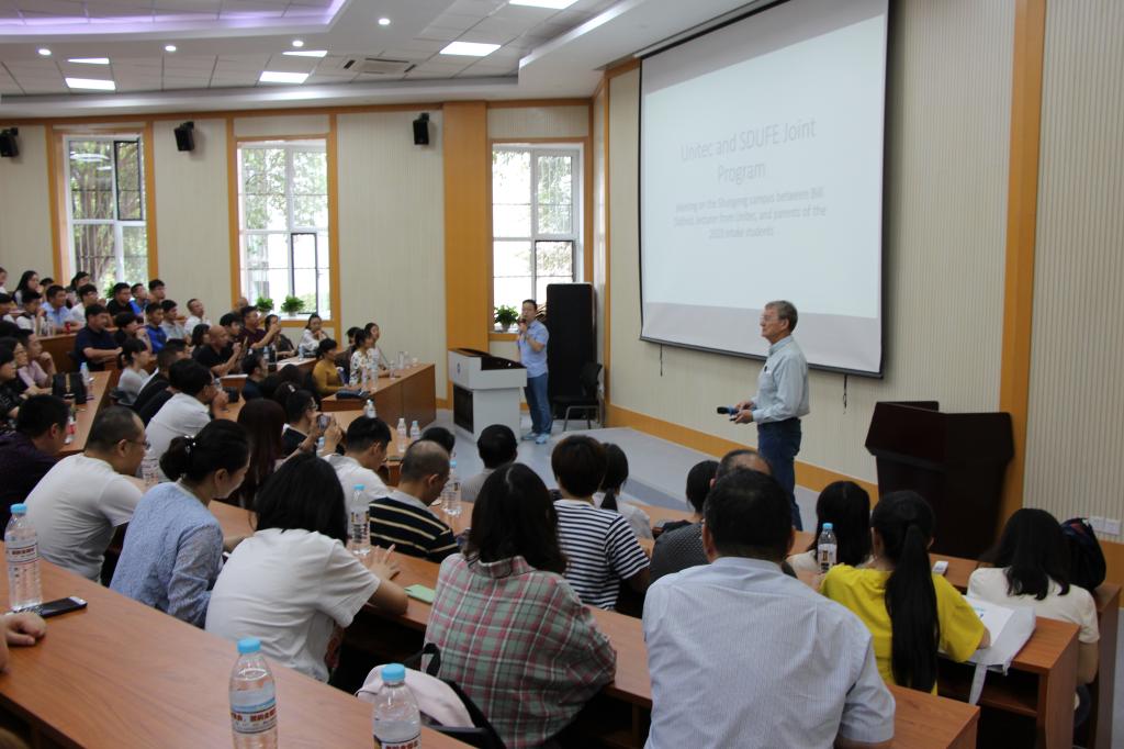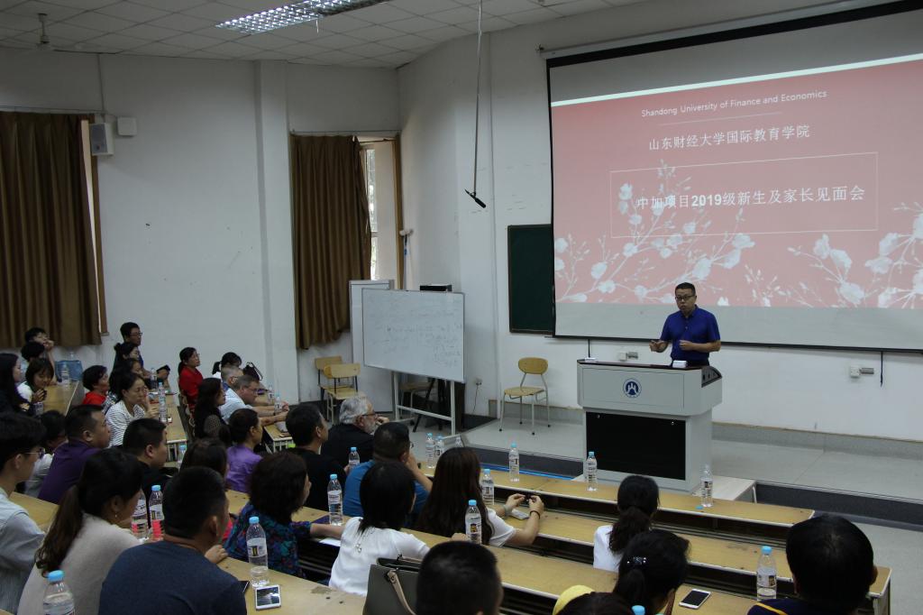 为使2019级新生与家长更好地了解中外合作办学项目特点和要求,帮助同学们做好学业规划,9月15日下午,2138cn太阳集团在舜耕校区第二阶梯教室、第三阶梯教室举办中外合作办学项目新生及家长见面会。学院党委书记张建、院长助理王英杰和中新项目外方课程协调人Bill老师出席中新项目见面会,院长刘增美、副书记于栋、中加项目外方管理人员Barry Lesser教授及在校任教的两名外方教授出席了中加项目见面会。